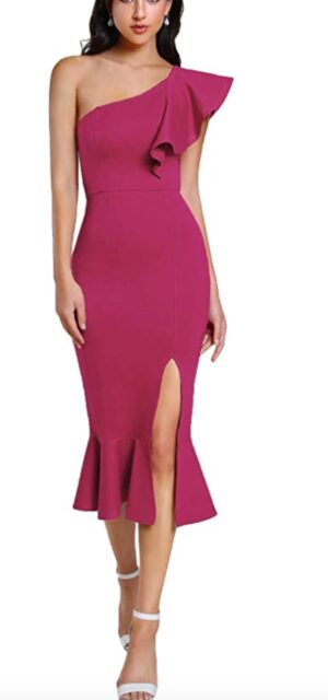 [ezcol_1half_end class=”shopping-content”]This is stunning on every level – and in my cart! The statement shoulder. The thigh-high slit. The body con form with a flattering waistline and ruffled midi length. EVERY. SINGLE. DETAIL. With stretch AND under $40?! Um, yes!