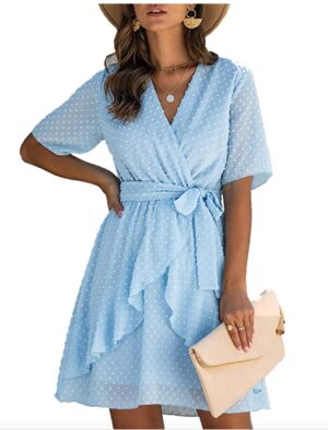 [ezcol_1half_end class=”shopping-content”]Last but certainly not least, the Amazon wedding guest dress I’m wearing in these photos! SO stretchy and doesn’t wrinkle. I will say, better for my bustier girls – I’m smaller-chested (obviously) and usually pin or double stick tape it a bit at the neckline for comfort. (I’d recommend sizing DOWN one – I wish I would have!). But it’s SO flattering on your curves, slimming with the knotted waist detail, and comfortable for dancing it up!