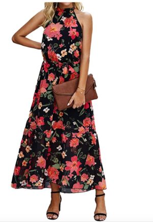 [ezcol_1half_end class=”shopping-content”]For a bold floral print, this dress does it right – and it’s another #1 Amazon bestseller for wedding guest dresses! 28 different color/print options, to choose from, and a classy halter option with a higher neckline that really shows off your shoulders!